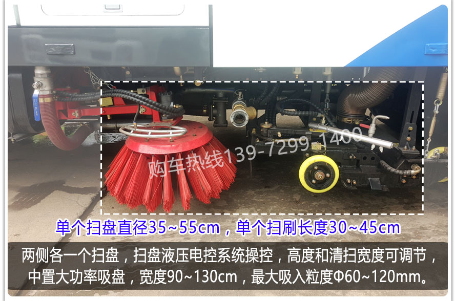 二、上裝配置: 1、帶2個(gè)中置掃盤;中置超寬吸嘴;雙層吸塵筒;康明斯170馬力副發(fā)動(dòng)機(jī),3800軸距多利卡配江鈴64kW增壓副發(fā)動(dòng)機(jī);臺(tái)灣液壓閥;大力馬達(dá);德國(guó)高壓水泵(前沖/側(cè)噴/中噴/后噴霧)/側(cè)沖洗水槍/垃圾箱自潔裝置);萬(wàn)向高壓路沿清洗;威龍低壓泵(前沖),氣動(dòng)球閥控制;4mm不銹鋼垃圾箱;不銹鋼水箱;德國(guó)控制器;尾部箭頭燈;機(jī)油、垃圾箱、水箱均帶防溢或低位報(bào)警裝置;倒車及洗掃狀態(tài)室內(nèi)監(jiān)視器;多種語(yǔ)音提示;倒車自動(dòng)保護(hù)、防傾倒垃圾翻車保護(hù)、檢修安全保護(hù);20m高壓沖洗卷盤;刷臂轉(zhuǎn)動(dòng)機(jī)構(gòu)使用德國(guó)進(jìn)口高新耐磨工程隔套